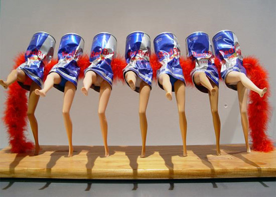 把空罐加上芭比的腳,就變出跳康康舞的紅牛坊舞者,把鋁罐折成裙子的技巧很高明。
