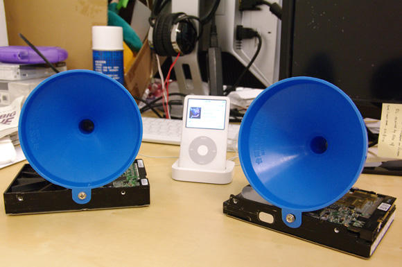原本書上是用兩台壞掉的iPod當成喇叭基座,但大人物手邊沒那麼多壞掉的iPod,但秉持著3C宅宅的精神,大人物決定用家裡兩台壞軌的硬碟上場,而五金行漏斗記得要買下面有孔的,才可以剛好用螺絲固定在硬碟上喔。