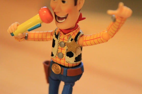 打開包裝之後,發現特撮公仔的零件真的做的很細,光是胡迪就有兩張不同表情的臉的可換,六隻手勢不同的手掌可以更換,還有一支很俏皮的麥克風跟牛仔帽跟寫有WOODY的黑色名牌。
