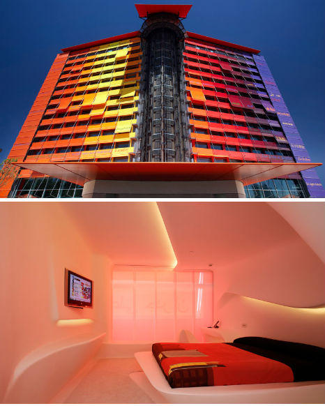 Hotel Puerta America的經典之處,應該在於它從裡到外,處處可見大師風采,旅館外牆將上詩人Paul Ellard著名作品Freedom的詩句,印在漸層式的繽紛色彩,內部十二層樓更大手筆的請來十二位國際知名的建築大師操刀設計,像是David Chipperfield低調的極簡單色哲學,Mark Newsom以紅色亮漆地板、白色大理石及黑色家具打造出來的時尚空間,Ron Arad充滿未來感的白色寧靜太空,以及其他走著日式極簡風格、不佳修飾的工業風格、以不繡鋼切面創造出的奇幻空間等各種族繁不及備載的風格,每到一個樓層,可得換上不同心情,才有辦法完全融入在名家作品之中。
