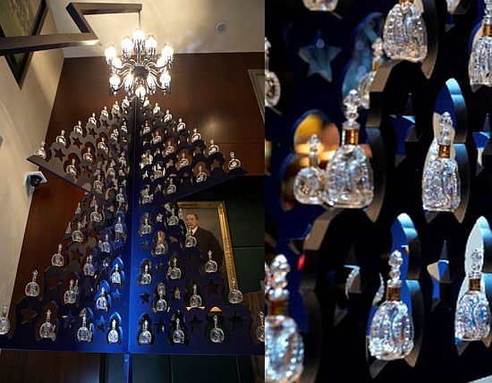 知名五星級飯店Sofitel London St James與水晶業者Baccarat及法國干邑酒商Louis XIII合作,純手工打造出200瓶迷你水晶酒瓶,排成聖誕樹的形狀,在燈光下顯得晶瑩剔透。