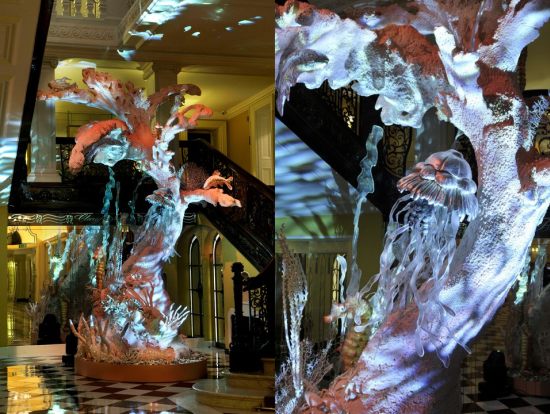 設計師John Galliano為Claridge旅館所設計的聖誕樹Under the Sea,彷彿隨著海波起舞的聖誕樹,海馬、魚、海葵、海星及水母悠游在銀色的葉子及粉紅色珊瑚之間,想必海底的聖誕夜,應該和人類城市一樣熱鬧吧!
