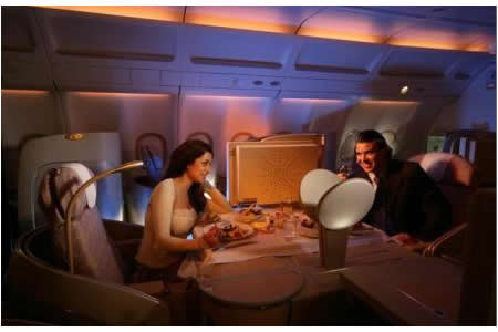 相較於前面兩個概念設計,都還停留在紙上談兵的階段,Etihad Airline所推出的鑽石座位Diamond Seat,就真的是「只要你有錢,就買得到」的豪華享受!Diamond Seat能180度旋轉,隨時與身邊的人來個面對面的近距離接觸,配合燈光(桌燈、閱讀燈)的調整,想在飛機上來頓燈光晚餐,或許不是不可能的任務,另外座椅還內建按摩功能,六段式調整椅背角度,如果累了想休息,座位也可以整個躺平變成一張床,飛機上還有專門的衣帽間以及以及迷你吧,坐累了想要動動身體時,可以過去晃晃,讓長途飛行不再像是空中監獄一樣讓人無法忍耐。