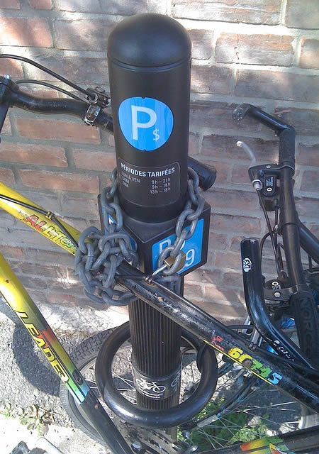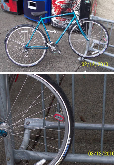 按理說,避免愛車失竊,把前後輪鎖在鐵桿上是最安全的作法,不過有個先決條件,那就是你的自行車不是快拆式,要不然最後剩下的也是前後輪。