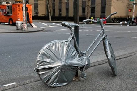 有時候過度追求完美是一件很可怕的事,尤其當你想鎖單車發現沒帶鎖,而身上只有一捆膠帶。一般人會把車纏綁在柱子上,他們則是會為了好看把整台車封起來。