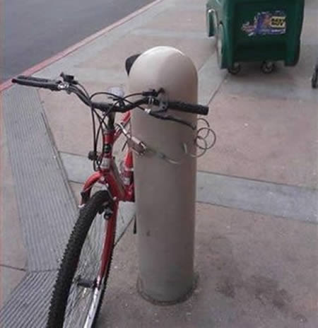 這張照片告訴我們,別以為買越大的鎖越安全,鎖在馬路旁的柱子上不是不行,但至少那柱子要超過一般人的高度吧。