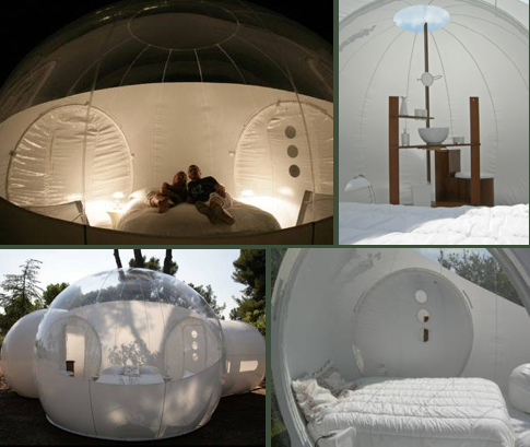 Bubbletree還有推出半透明版的「BubbleRoom」,不是像毛玻璃的那種半透明空間,而是將360度的全景泡泡縮減成240度,抬頭一樣可以仰望星空,躺下來外頭卻看不到你,如果有長期抗戰的打算,還可以在BubbleRoom旁多加一個「Bubble」,作為浴室或是其他空間,成為滿足更多生活機能的BubbleLodge喔!