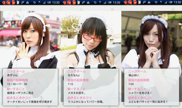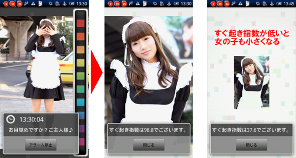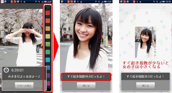 這個由日本公司Biglobe研發的鬧鐘程式「Mezamashi Kanojo」,適用於各種智慧型裝置(iPhone/iPad/Android),裡面內建了許多精選過的日本正妹,當鬧鈴響起時,隨機出現的正妹就會用很萌的方式叫你起床,她會遮起雙眼讓你猜猜她是誰,但是當你賴床的時候,正妹的照片就會縮小,讓你遺憾終生.....呃.....沒那麼嚴重啦!只要你在手機上對她 上下其手 輕輕觸碰的時候,正妹就會轉過頭給你一個大大的起床微笑喔!