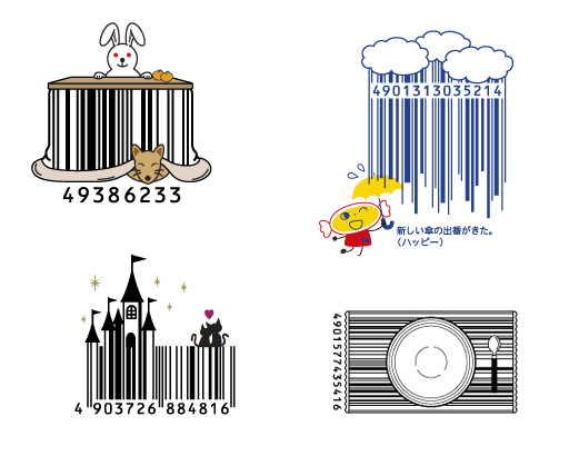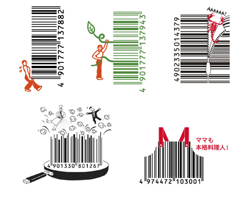 這些條碼有食物、有人物,全部都是運用條碼裡有空白和粗細不一的黑色條紋,加上了其他圖樣的組合,就變成讓人不得不注意到的條碼設計,除了讓銷售流程更便利,也幫品牌特色小小打了廣告加好多分。看看這些圖,把產品和死硬的資訊結合的真好呀!