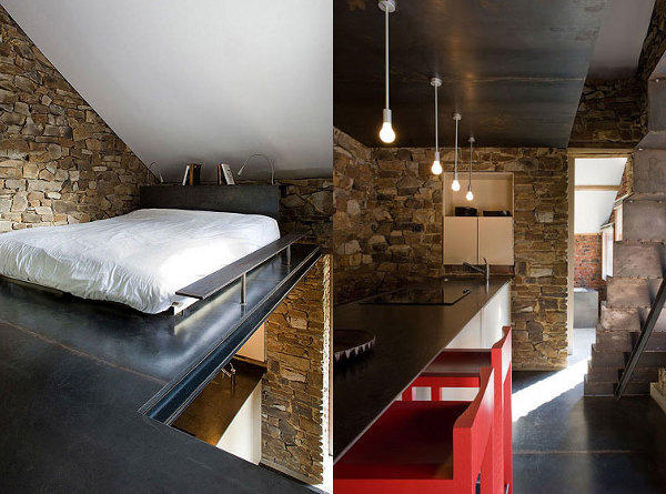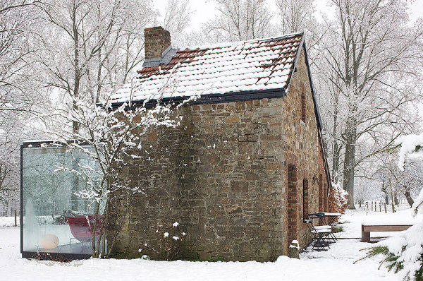 許多舊屋翻新的案例都是從屋子原有的結構著手,完工之後,幾乎看不出屋子的原貌,然而也有些以房屋的舊有結構作為新的出發點,像是比利時的The Roly House,原本是冷冰冰的石造車庫,改裝之後,設計師保留了石頭外牆,室內以搶眼的紅色坐椅作為吸睛重點,並在屋後添了新的溫室,二樓擺放著舒適的白色雙人床,變成了供旅人休憩放鬆用的B&B。