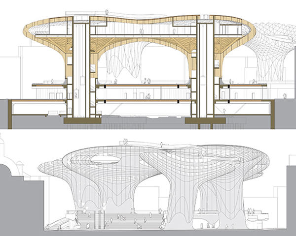 Metropol Parasol是由J. Mayer H. Architects設計、建造,木造式的蜂巢式結構,彼此相互環扣著,編織出成片的雲朵,也有點像把超級大陽傘,這座現代化建築物的出現,不僅稍微中和了塞維亞的中世紀韻味,也成為塞維亞的新地標,而「傘」下的樓梯和店面,更將Metropol Parasol拱成世界上最大的木造建築物。