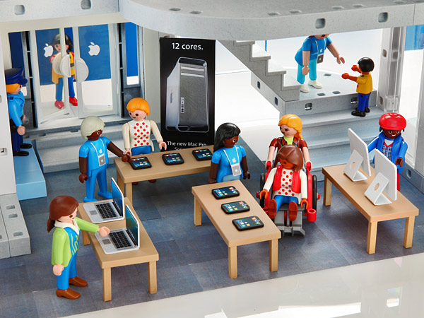 有鑑於此,德國玩具品牌「PlayMobil(摩比)」日前在國外網站ThinkGeek推出以縮小版的Apple Store為主題的玩具組,裡頭的建築、角色設定完全比較Apple Store啊!包含了建築、人物與超過60種iPod、iPhone、iPad、Macbook等蘋果相關配件,相似度簡直是破表啊~