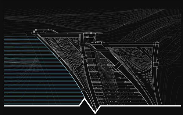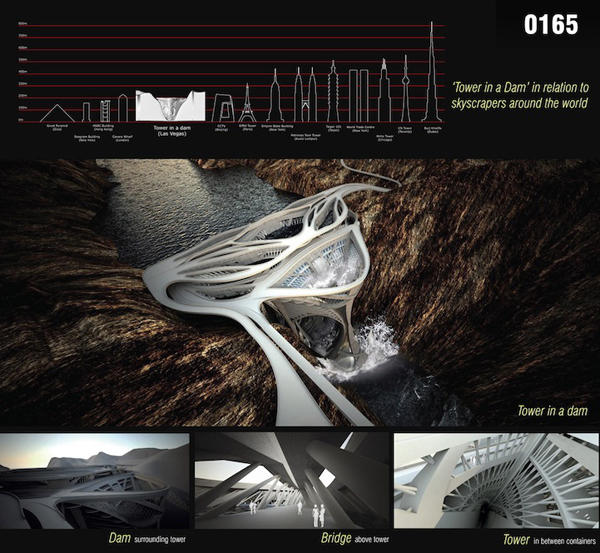 胡佛水壩高222公尺,寬379公尺,盤據在Black Canyon之上,儲存科羅拉多河的河水,為南加州各城市提供水源,水壩每秒鐘可釋放四十萬立方英尺的水量,每年發電量達到42億Kwh,是世界知名的建築工程之一,然而胡佛水壩大歸大,灰濛濛的水泥建築總是少了點美感,於是在今年的eVolo摩天大樓比賽中,英國的馬來西亞建築師Yheu-Shen Chun便決定為水壩設計個新造型、新概念、新功能,從講究蓄水發電的實用性質,轉變成兼顧藝術、觀光的超級建築物。