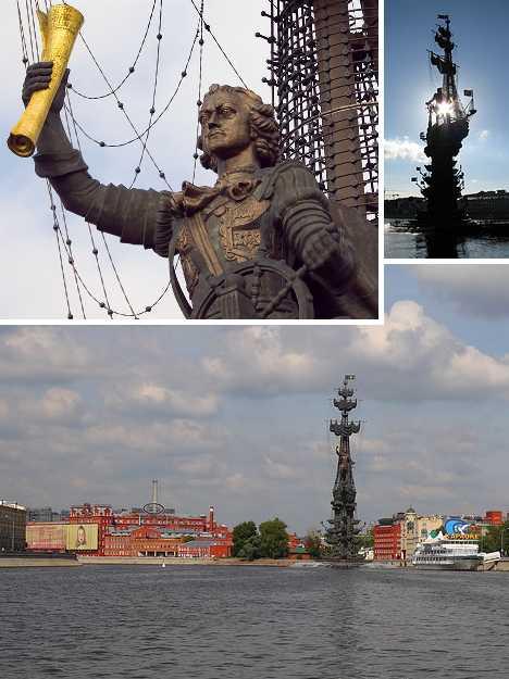 喬治亞建築師Zurab Tsereteli所設計的彼得大帝紀念雕像,有名歸有名,卻不太得莫斯科人喜愛,原因無他,自從1997年公開亮相以來,每每票選全世界最醜的建築物時,它都榜上有名,據說原本Zurab Tsereteli打算用發現新大陸的哥倫布作為主題,結果美國、西班牙或拉丁美洲都找不到人願意接收這尊雕像,他只好修改一下,送給他的好友,也就是當時莫斯科市長Yuri Luzhkov,作為俄羅斯海軍三百週年生日禮物。