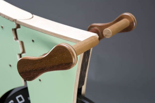 全車都由木頭打造而成的「SplinterBike」,由樺木膠合板組成齒輪、車輪及車架,剩下的輪軸是由硬木製成,軸承是鐵木製,至於掌控方向用的手把和腳上踩的踏板,則是從舊掃把拆下來,雖然從外表看起來,SplinterBike不怎麼起眼(而且還總讓筆者想到綠色的牛),有點難激起人想要跨上它的慾望,不過一旦知道它最高時速號稱來到30英里(48公里)時,應該大家的腳下的熱血又回來了吧!