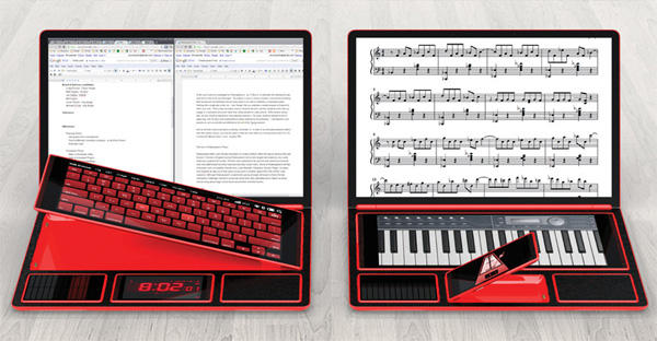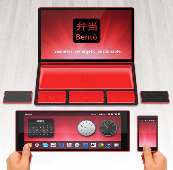 美國Rhode Island School of Design(RISD)的設計系學生Rene Lee聽到大家的需求囉!他所設計的「Bento Book」,就像個便當盒一樣,裡頭一隔隔的空間放的當然不是媽媽的愛心午餐,而是平板電腦、手機、電池及硬碟,搭配「便當盒蓋」上的銀幕,合起來剛好組成一個隨身攜帶的筆電。