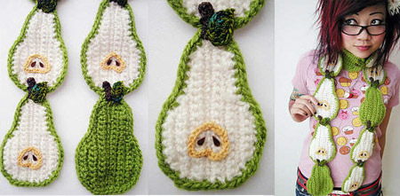 用許多切片西洋梨當作設計題材未免也太可愛了,這樣在路上遠遠看到還以為是哪位水果商掛了一串西洋梨出來逛大街。也許可以幫這款西洋梨圍巾加入水果香,噱頭想必一定更大,不過要是出一款榴槤圍巾…。