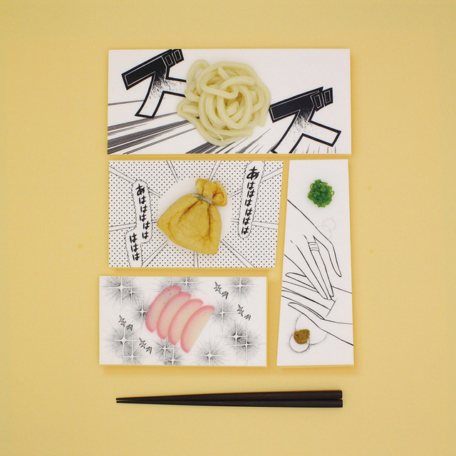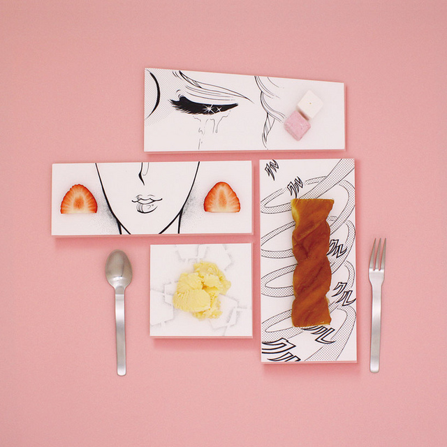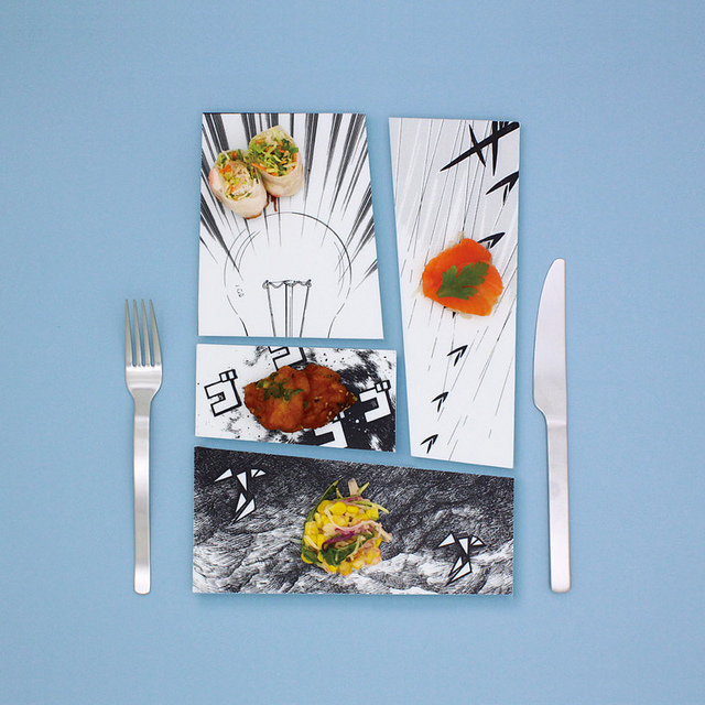 日本設計師 mika tsutai 結合了日系傳統漫畫與黑白元素,設計這樣一器列有趣的盤子。藉由廚師之手利用食物來排盤裝飾互動,使得整體上形成一種有趣的視覺效果,讓一盤佳餚變成一個具有主題故事性的漫畫,當然用餐者也可以自由在上面點綴增加故事內容。