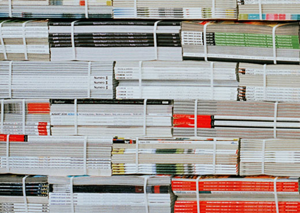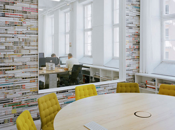 是的,你可以想像一間廣告公司每天會收到多少有用的、沒用的、專業的、垃圾的週刊雜誌嗎?多虧了Elding Oscarson將這些書籍捆好,再按照大小、形狀堆疊成牆,白色的牆面上參雜著各種顏色,不過於雜亂又沒有壓迫感。