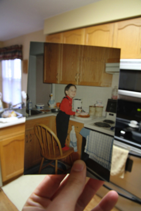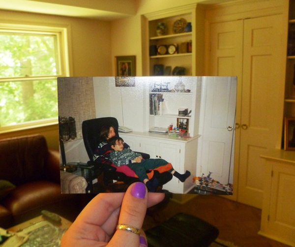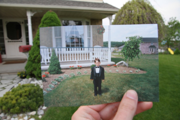 其實這是美國安大略湖區的一位廚師Taylor Jones,有一天在翻閱家庭老照片時,看到一張自己弟弟剛好坐在同一張桌椅的老照片,於是就突發奇想將老照片與當時拍照的場景合影,創作成一張張充滿懷舊趣味的「合成照」。