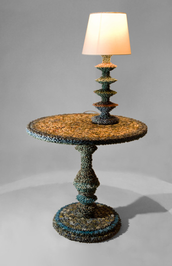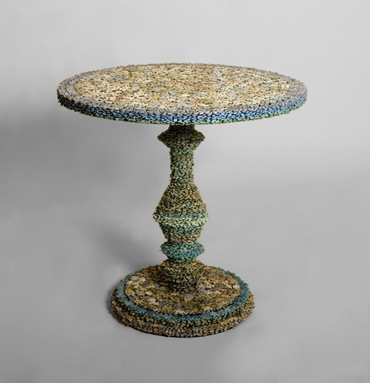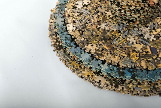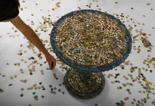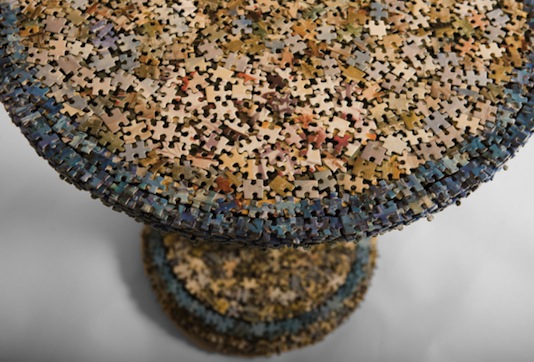 27歲的Rupert McKelvie因為受不了拼圖老是拼到最後少了那幾張(相信應該許多人都有這種慘痛的經驗啊XD),所以他決定擺脫拼圖必須按照上頭圖案拼裝的思維,跳脫出來用決定將這些慘痛的經驗,轉化成全新概念的創作,所以他將不完整的拼圖,經過上百小時的組裝拼貼過程,創作了這張用4800張拼圖拼貼而成的拼圖圓桌。