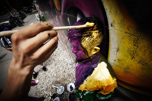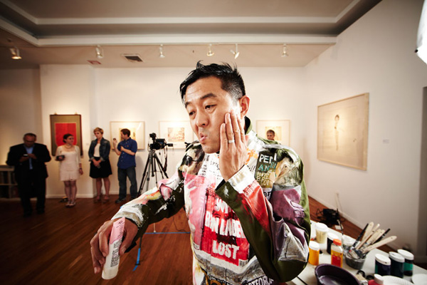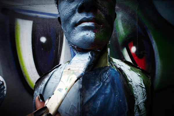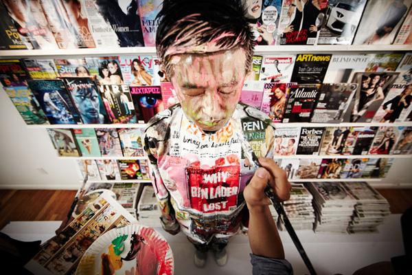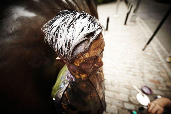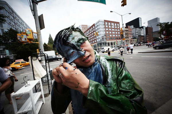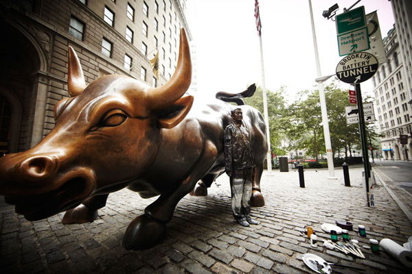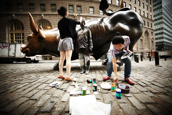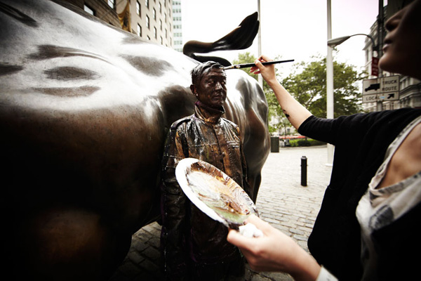 這一回勃麟老兄他前進大蘋果,受到紐約藝廊Eli Klein Fine Art的邀請前往開設個展,除了先前在中國大陸創作的「都市迷彩」系列之外,既然到了紐約這貴寶地,劉勃麟當然也要在紐約當地著名地標,像是華爾街的大銅牛、紐約下城的kenny scharf街、紐約特色的書報攤前等地,留下他偽裝神技的全新創作,也讓中國隱身術在紐約發揚光大啊!