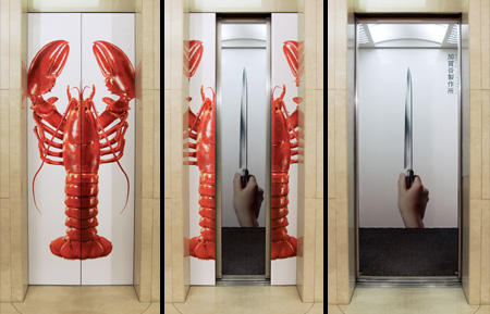 這種電梯,如果精神不好時應該會被嚇到吧?畢竟那把刀那~麼~大一把…啊?重點是龍蝦啊?