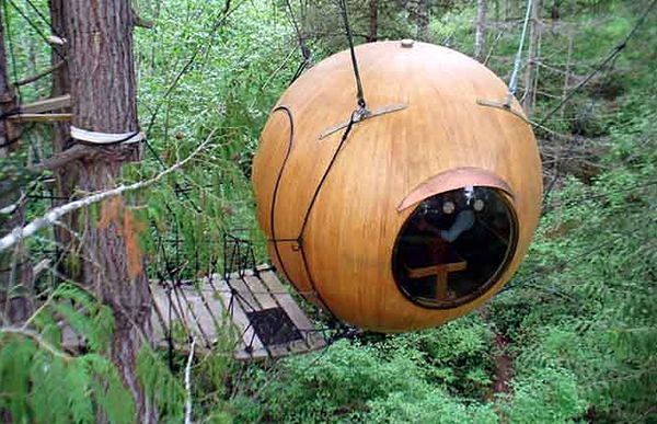 這顆又大又圓的球型木屋,出自於Tom Chudleigh之手,整顆木球屋以純手工打造,並以當地木材及玻璃纖維為主要材質,外頭連接著電線,提供球內居民所需的電力,每顆球屋最多可以容納四個人,看來空間也沒有想像中的小,就是不曉得風吹過來的時候,整顆球會不會像盪鞦韆一樣晃動、滾動呢?