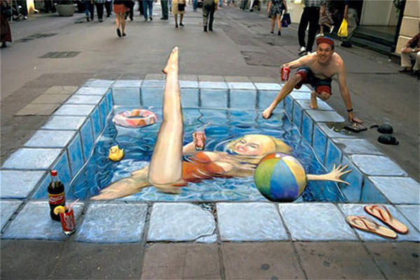 Julian Beever從1990年代中期,就開始了他的街頭創作生涯,看著他整個人跪在地上,以粉筆創作出一幅幅驚人的街頭3D圖,不免讓人讚嘆他對於視覺影像及角度掌握之精準,光是看到躺在泳池伸出一隻玉腿的誘惑著大家的比基尼金髮辣妹,就讓人忍不住想跳進泳池啊!