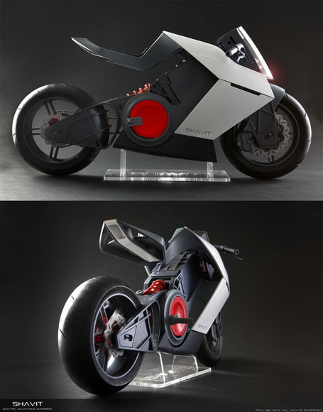 Shavit電動超級摩托車是Eyal Melnick所設計的,這是他在以色列Shenkar設計工程學院的畢業作品,他的目標是設計一款終極的日常運動摩托車。這種電動超級摩托車的設計具有獨特的座椅調整功能,這個調整功能包含了控制把手,可讓騎乘者在賽道或是市區轉彎時改變騎乘姿勢,易於控制,而在平常又可提供舒適的騎乘姿勢。