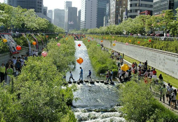 過去幾乎被首爾市埋葬的清溪川,經過一連串的整治工程之後,如今的清溪川公園全長5.6公里,豐富了當地的自然生態,吸引不少昆蟲、魚類、鳥類等野生動物群聚於此,並間接降低市區溫度,縮短南北首爾之間的距離,成為首爾的綠色走廊,市民休閑娛樂的好去處。