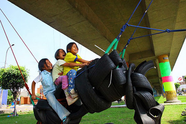 祕魯的Ghost Train公園可不是什麼鬧鬼的公園,而是西班牙團體Basurama改裝廢棄火車站而成的綠色公園,廢棄輪胎搖身一變成為孩童們盪的鞦韆(還是小馬的形狀)、攀爬的支架,四處充滿的歡樂與笑聲,大人小孩都愛去。
