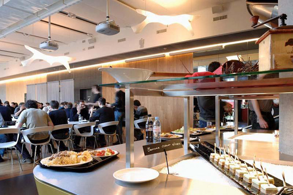 另一個在Google工作絕對不會無聊的原因,大概就是公司中隨時隨地都有得吃、有得喝,不管什麼時候來到咖啡廳,都有各種不同美味又健康的有機食物,而且每個咖啡廳還有專屬的「主廚」,隨時穿梭在用餐區,詢問員工的意見,然後加以改進,和一般只求吃得飽就好的員工餐廳完全不一樣。