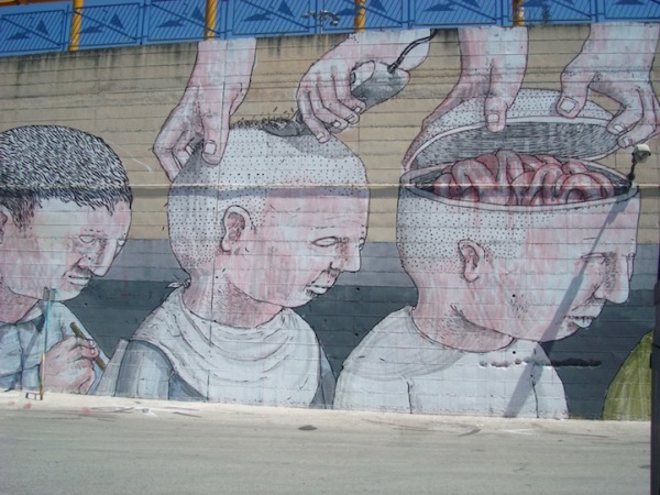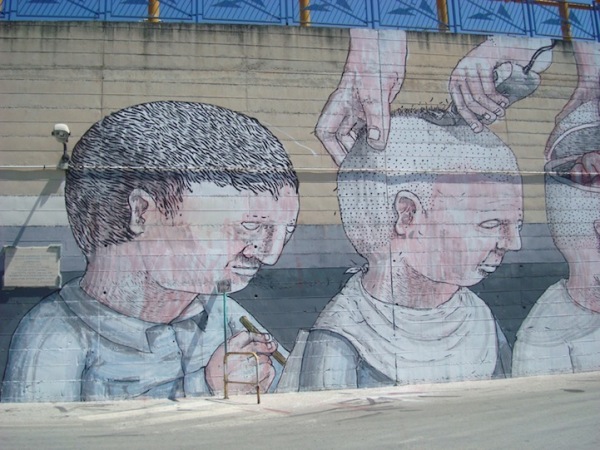 這面牆上的塗鴉是由義大利街頭藝術家BLU所繪製的,他的作品遍及歐美各地,擅長在倉庫、辦公大樓,公寓等牆面上塗鴉,繪製的主題也沒有一定的規則,只是這幅畫剛好戳中我了(淚)。