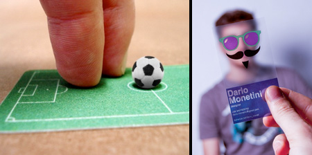 把名片設計成足球場,讓人可以在上面踢踢球,打發時間的同時也能記下你的名字。