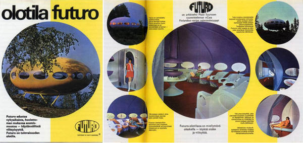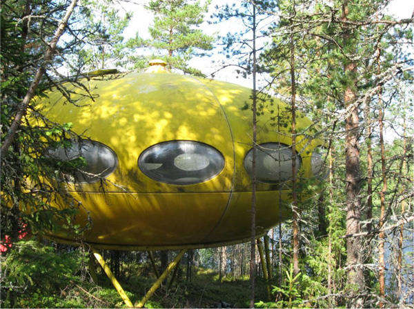 Futuro House是芬蘭設計師Matti Suuronen在1960年代的作品,直徑26呎寬、10呎高,橢圓形造型搭配類機艙式的門口,看起來還真的比較像飛行器,而不是住宅,當初會設計成橢圓形,並不是為了和飛碟扯上邊,而是想要利用最少的建材,創造出最大的空間,不過Futuro House背後所衍生出來的行動住宅概念,倒是跟飛碟一樣,可以隨時遷移,成為當時未來住宅的經典。