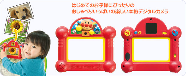 日本玩具公司Takara Tomy推出一台3歲以上孩童專用的數位相機,簡化了很多數位相機的功能,造型也設計成讓小朋友能2手一起掌握的大小,小朋友也能一下子就用的上手!雖然是給小朋友用的,不過它還是有3百萬畫素、1.44吋的LCD螢幕、定時器、可儲存99張照片,而且麵包超人還會跟小朋友聊天喔!