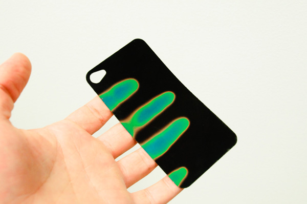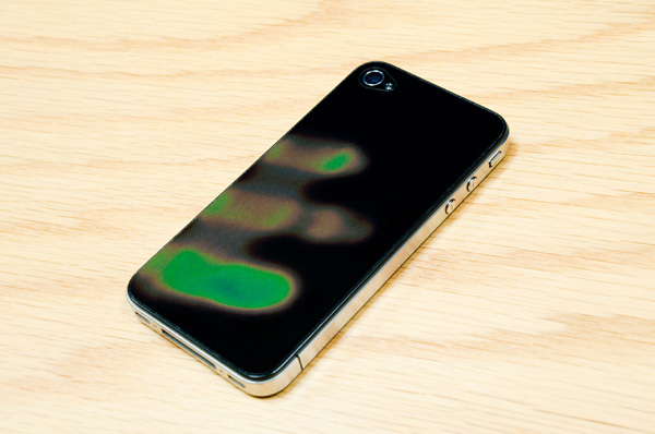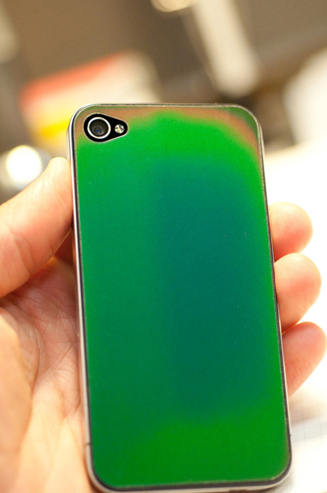 這其實是一張由RF Laserworks所研發、厚僅0.005吋的貼紙,可以直接黏在你iPhone背上。在室溫下外觀和一般iPhone背蓋沒什麼太大的不同,但遇熱時則會變色。該特殊材質在接觸到熱度時會依照該熱度多寡顯現不同的顏色,由冷至熱的顏色包括:黑(冷)、紅、黃、綠、藍(最熱)。如果家裡沒有體溫計的朋友,買來發燒時也可以直接貼到額頭上量體溫啊!(大誤)