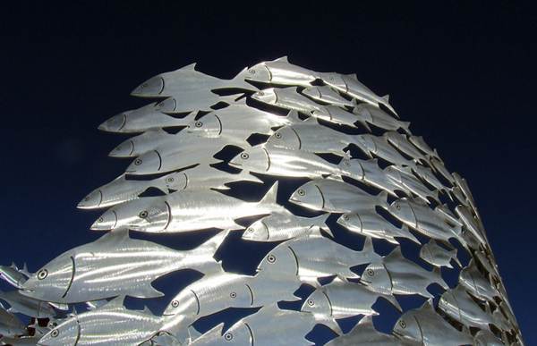 藝術家Richard Howie以魚群為創作主題,創作了一大座閃閃動人的魚群雕塑,遠遠看來相當壯觀,有種 爸爸捕魚去怎麼還不回來 數大便是美的美感,說到創作的靈感Howie說:「快速移動的魚群之中,有種閃爍亮眼的美感。」真的是如此,即使在陸地上陽光照射之下,這座魚群雕像更是吸引目光啊!