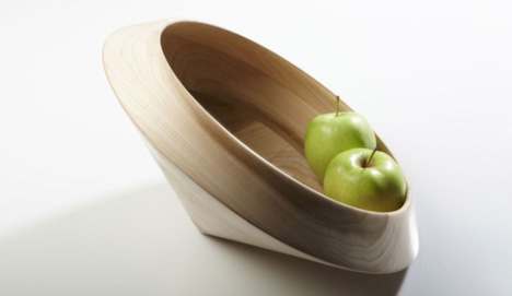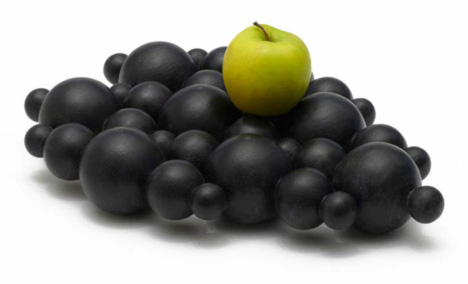 這款水果盤的設計概念為適合任何大小與形狀的水果擺放,並以葡萄串的形象為形式製作,使用黑色或白色的木片雕製而成。