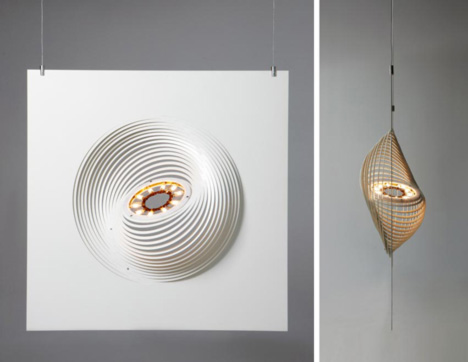 最後這一款設計是此一系列中最抽象、也是唯一使用非木材元素製作的產品,其靈感來自於魚的腮,當整展照明燈具被展開與開啟時,將在四周的牆上投射出令人讚嘆的光影圖像。