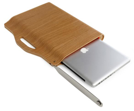 這款筆記型電腦包可以容納一個17”的筆記型電腦、電源以及滑鼠,除了大部分材質為木材,有別於一般電腦包的柔軟之外,更於開口處設計了一個不鏽鋼的開關, 可以讓使用者將包包鎖起來!