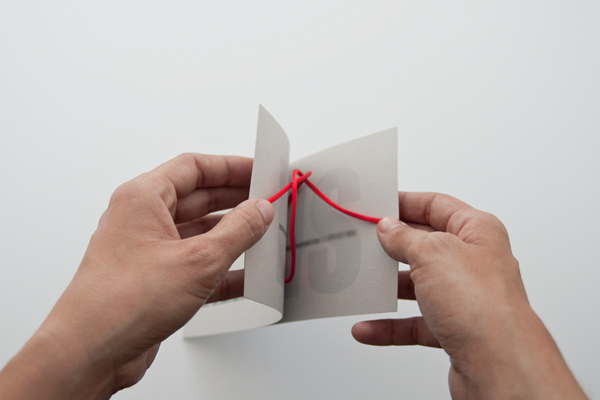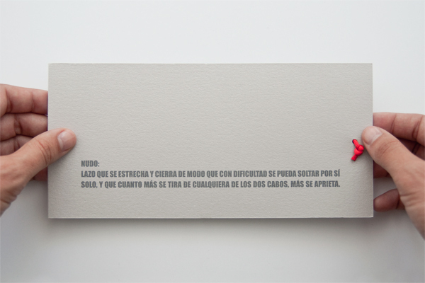 Cristina Moralejo所設計的名為”結”的婚禮喜帖讓人看了會忍不住會心一笑。喜帖有著白色的外觀,折疊式的設計,簡單而清楚。喜帖兩端被穿入了紅線,當讀者將喜帖打開,就像是啟動機制一般,紅線便會順勢在卡片中打結,彷彿讓人見證了新郎跟新娘手中月老的紅線牽引兩人相遇,並進而解下不解之緣。儘管設計十分簡單樸素,卻因為這點幽默的巧思讓喜帖變得與眾不同。