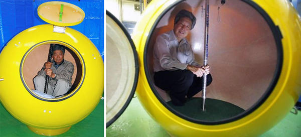膠囊版的「諾亞方舟」以強化玻璃纖維打造,外表是在大海載浮載沉時救難隊絕對不會錯過的亮黃色,內部是足夠容納一家四口(而且還是四口成人)空間,並設有空氣孔供空氣流通,還開了個小小瞭望窗,隨時觀察外頭情況,號稱防水、防火、防撞、防滑、防打、防沖擊,再怎麼可怕的海嘯來襲,躲進去至少保住一線生機。