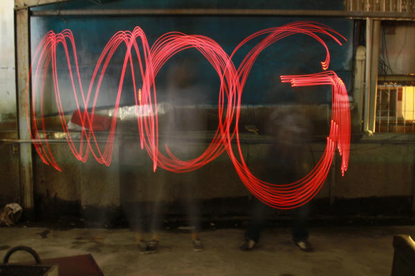 大家應該沒想過單車包也能拿來玩光影塗鴉吧,呵!而且光影塗鴉可是會上癮低~像是大人物團隊一玩就不可收拾,寫完了「MOG」還想挑戰高難度的「大人物」,特別是那個「物」,除了要反著寫字之外,還要用手遮斷字,相當地有難度。