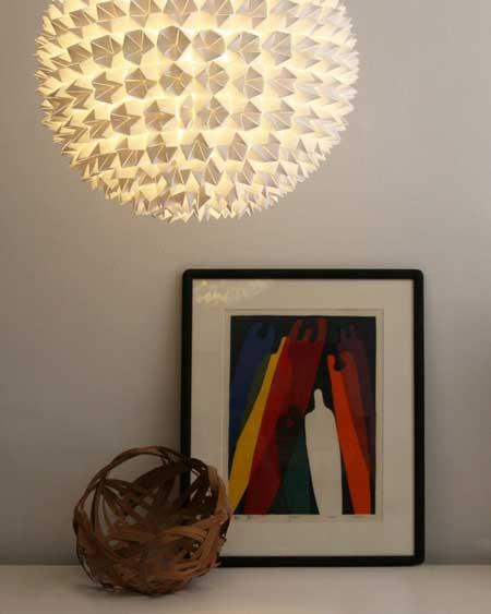 看起來很漂亮的摺紙吊燈,其實背後有相當繁瑣的製作程序,首先必須先摺出上百張的東南西北,在將它們一張張組合成立體球狀,還必須考量到是否會過熱的問題,當然成品是相當的賞心悅目,誰會想到兒時的掌上摺紙也能夠變成一盞這麼好看的吊燈呢?如果你有興趣購買的話,可以上Etsy網站,一盞250美金,這裡買。