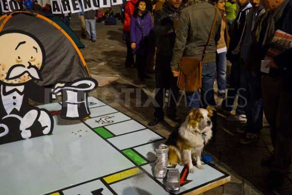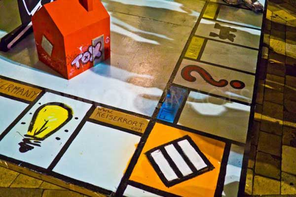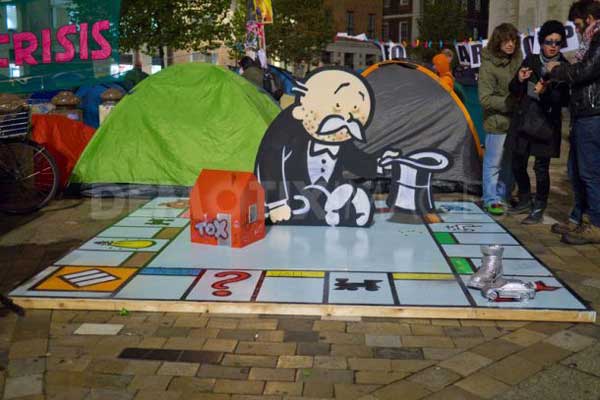 所以,這個來自塗鴉奇才Banksy的作品,目前正在倫敦的聖保羅大教堂前展示,確實能引起廣大注目啊!Banksy長期以來就擅長以反諷或是戲謔的手法,透過塗鴉表達他對社會或是政治議題的看法,這個出現在佔領倫敦(Occupy London)活動,由Bansky所製作的大富翁遊戲(Monopoly City Streets),是足以反諷資本家的末路?