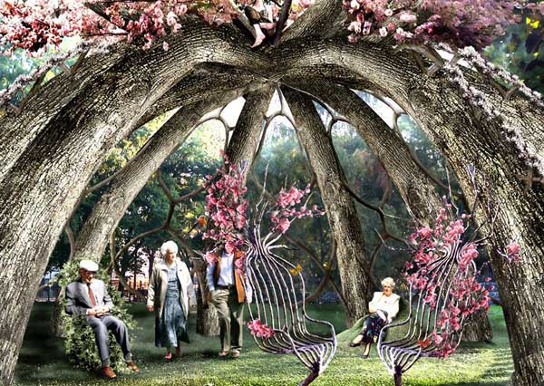 Visiondivision運來了10棵日本櫻花樹,和助手們透過包括彎折、扭轉、修剪、嫁接、編織等特殊技巧,甚至連該澆多少水、接收多少日照都計算在內,引導櫻花樹生長,10棵櫻花樹在特意安排下,圍成直徑8公尺的圓圈圈,樹幹向中心集中伸展,枝葉交錯,最後變成沙漏造型。