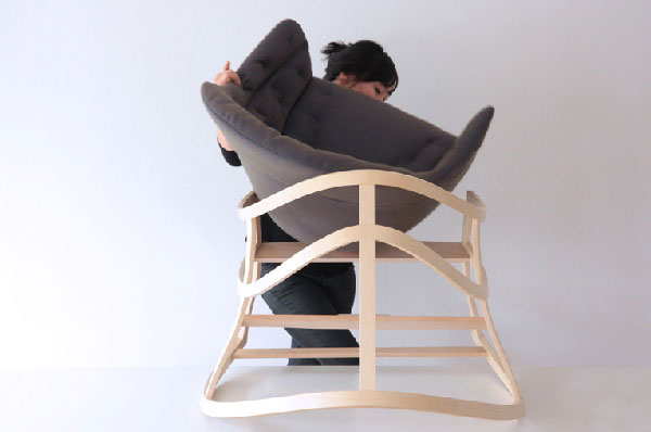 這把木頭結構的優雅搖椅,底座採用了彎曲起伏的摟空木頭結構,讓這張搖椅多了些空靈優雅的氛圍,而貝殼狀的軟墊,提供使用者舒適的躺坐體驗,而座墊都是可拆卸方便清洗,實用又美觀的設計。