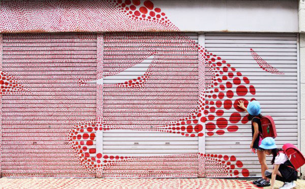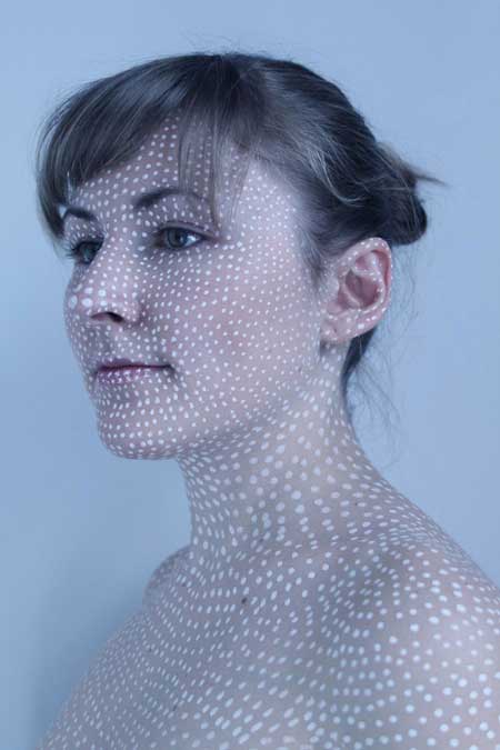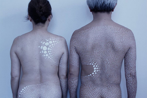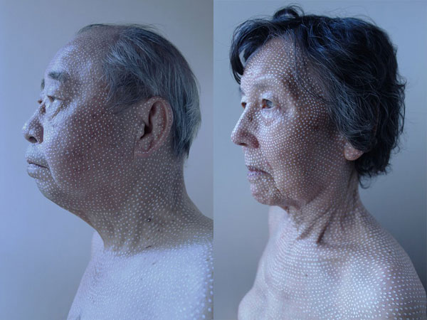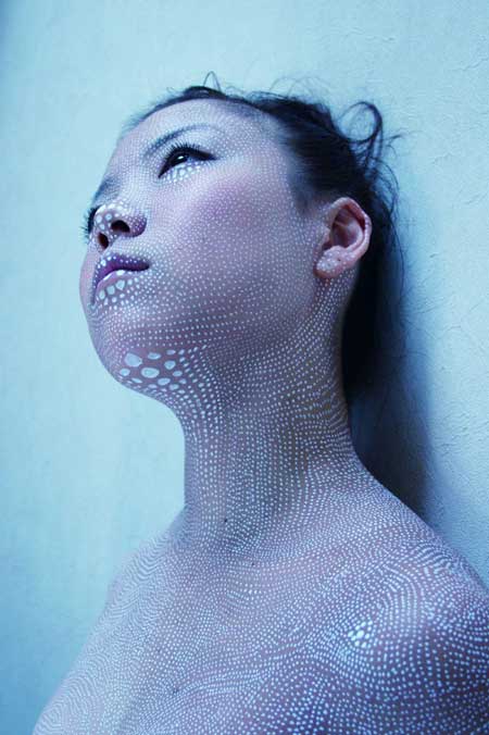 為什麼突然說起這個故事呢?別誤會,咱們沒打算過完西洋版的萬聖節之後,馬上發起東洋版的萬聖節活動,而是學生設計師Miharu Matsunaga最近完成的攝影作品「ten-ten」(就是日文中的「點點」),不辭辛勞在人體上點上數以百計的「點點」,讓大人物不小心想起這個鬼故事啦!